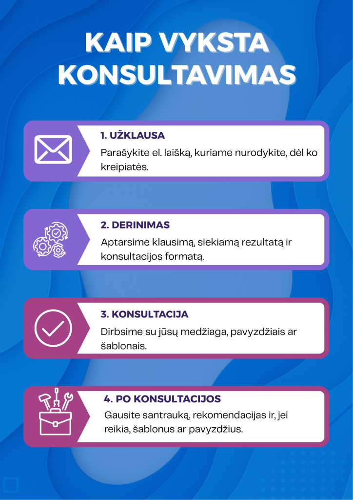 Konsultacijų metu jūsų pateikta medžiaga ir duomenys bus naudojami tik jūsų didaktinės veiklos tobulinimo tikslams. Laikomės akademinio sąžiningumo, autorių teisių ir asmens duomenų apsaugos reikalavimų.